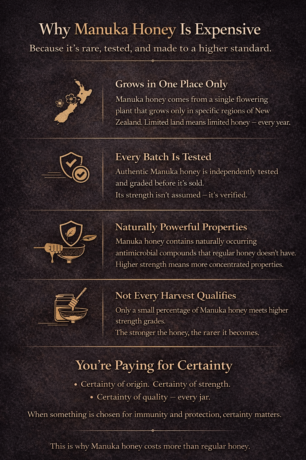 Manuka Honey MGO 356+ is a high-strength Manuka honey with a deeper, more premium taste and a thicker texture. It’s ideal for customers who already use Manuka honey and want a stronger grade for a more focused daily routine.
